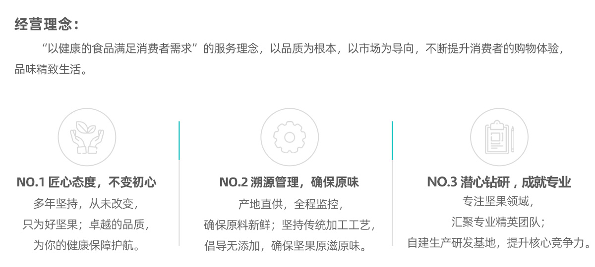 致力于建立自主独立的产、供、销供应链,原料全球采 ,生产自主来 。 坚持少添加,最大可能地保持食品的营养成分,向消费者提供有质量的健康食品。