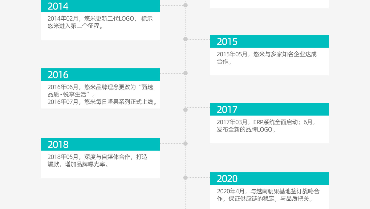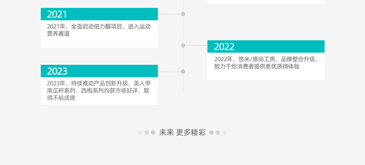 “悠米”,以“ 甄选品质•悦享生活”为使命,倡导 “乐活•原生”健康、可持续的生活方式;“原尚工房”,秉承“成为健康食材探索家”,愿景是成为具有国内健康食材先导理念的品牌,给消费者提供优质的体验;“倍力醒”,以“能量型”含片为主,致力于满足运动人群的生理代谢状态、运动能力及对某些营养成分和特殊需求的运动营养食品研发。